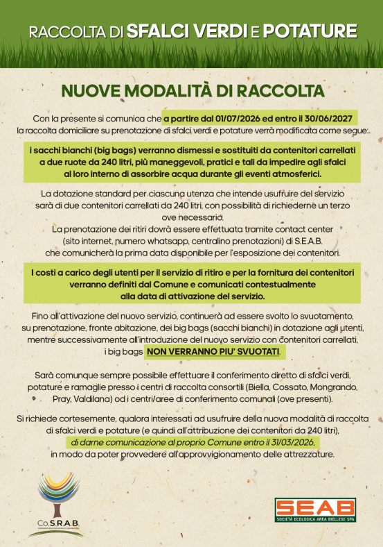 In allegato locandina avviso con le modifiche sulle modalità di raccolta degli sfalci verdi.