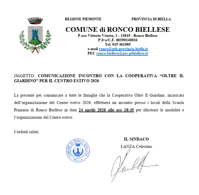 Venerdì 24 aprile 2026 alle ore 18:45 presso i locali della Scuola Primaria si terrà un incontro con la Cooperativa Oltre Il Giardino in cui verranno esposte le modalità organizzative del Centro Estivo 2026.